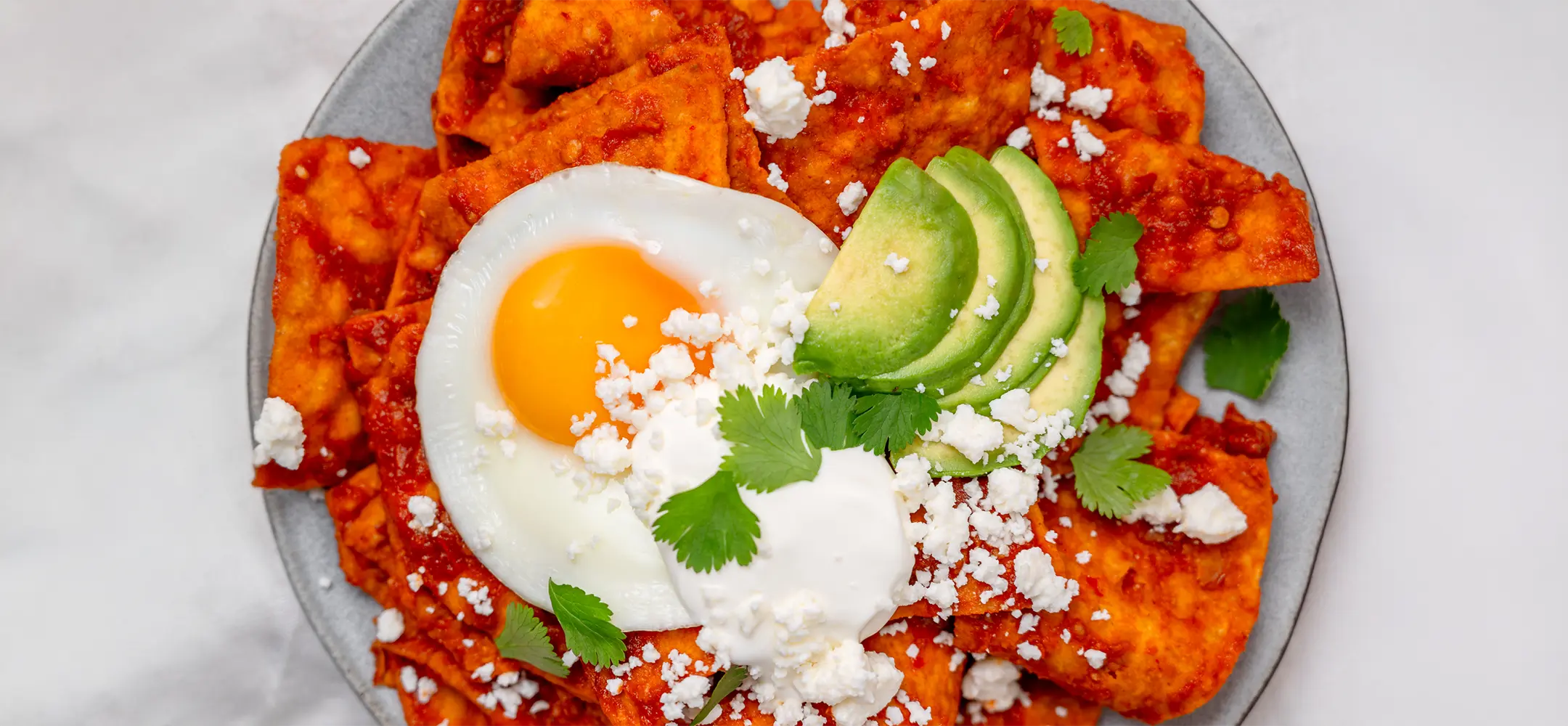 Totopos crujientes bañados en una salsa roja ahumada y llena de sabor — un clásico desayuno mexicano. Cubiertos con huevo, queso y aguacate, y preparados con los Totopos de Maíz de El Comal, cada bocado es cálido y delicioso.